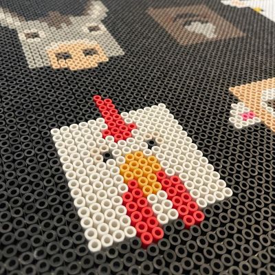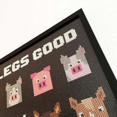 In meiner Pixel-Art-Version bleibt Orwells Geschichte nicht nur als politische Parabel lesbar, sondern auch aus einem veganen Blick heraus. Die Tiere stehen hier nicht nur für Klassen und Rollen, sondern für individuelle Lebewesen, die benutzt, manipuliert und letztlich verraten werden –im Namen höherer Ziele. Das Material – Bügelperlen, ein System aus Raster und Wiederholung – unterstreicht die Mechanik dahinter: Gleichförmigkeit, Kontrolle, Vereinzelung. Zugleich ist jedes Tier handgesetzt, jedes Pixel ein bewusst gesetzter Akt – ein Zeichen gegen Entwertung.