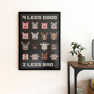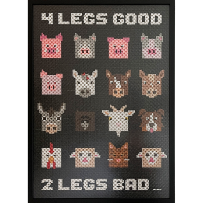 Dieses Werk aus der Reihe „Book Beads“, in der ich mich der Visualiserung für mich bedeutender Bücher widme, bezieht sich auf George Orwells Fabel „Animal Farm“ (1945) – eine Erzählung über Ideale, Verrat und Macht. Zentrales Thema ist der Satz: „4 Legs Good, 2 Legs Bad“ – im Roman ursprünglich ein Ausdruck für den Zusammenhalt der Tiere gegen menschliche Unterdrückung. Doch der Slogan verkehrt sich, wird korrumpiert – genau wie die Revolution, die ihn hervorbrachte. Die 16 stilisierten Tiere der Farm – von den dominanten Schweinen bis zur namenlosen Ziege sind bewusst minimalistisch gestaltet – reduziert, aber eindeutig. Sie erscheinen wie Symbole, Schatten oder stille Zeugen eines Systems, das sie nicht befreit, sondern instrumentalisiert hat.