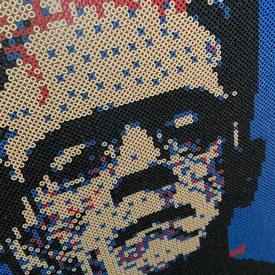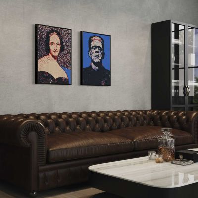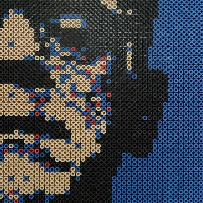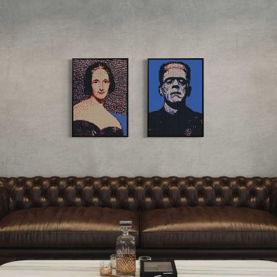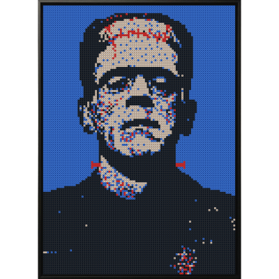 Dieses Werk zeigt das wohl bekannteste Missverständnis der Literaturgeschichte: Frankensteins „Monster“ – verpixelt aus Tausenden Bügelperlen, starr, fragmentiert, genäht, zusammengesetzt. Die Figur, meist mit dem Namen des Schöpfers verwechselt, stammt aus Mary Shelleys Roman „Frankenstein or: The Modern Prometheus“ (1818), einem Meilenstein der Literaturgeschichte – geschrieben von einer jungen Frau im Alter von 18 Jahren, veröffentlicht zunächst anonym, um nicht von vornherein abgewertet zu werden. Das Gesicht der Kreatur, wie wir es heute kennen, ist das Produkt späterer Adaptionen – ikonisch geworden durch Film, Popkultur und Karikatur. In dieser Arbeit wird es durch Pixel und Perlen neu konstruiert – Stück für Stück zusammengesetzt wie der Körper des Wesens selbst. Jede sichtbare „Naht“ verweist auf das Thema des Romans: Wer entscheidet, was menschlich ist? Was passiert, wenn wir Leben erschaffen – aber keine Verantwortung übernehmen? Im Werk steht die Kreatur isoliert auf blauem Grund, zwischen Technizität und Verletzlichkeit. Ein Abbild einer Figur, die eigentlich nie böse war – sondern nur ungeliebt.