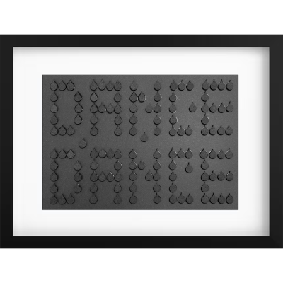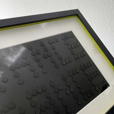 Heraus kommt: Ein „DANCE DANCE“ – Schwarz auf Schwarz – aus Moosgummi-Tränen, die ich extra so mit Sekundenkleber verklebt habe, dass sie noch von ein wenig „Tränenflüssigkeit“ umschlossen werden. Dieses Unikat habe ich in einer für mich schwierigen Zeit gefertigt – aber ein ist ganz klar: Tanzen hilft immer! Also: Einfach laufen lassen (die Tränen bitte!) und weiter tanzen – einmal alles raus, dann gehts ein bisschen besser. Daher auch das kleine, aber feine, Detail im Inneren des Rahmens: ein neongelb lackierter „Hoffnungsschimmer“.