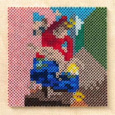 „Bis der Heiligenschein vom Kopf fällt!“ – Mit „Die Jungfrau züchtigt das Jesuskind vor drei Zeugen“ schuf Max Ernst 1926 ein bis heute verstörendes Schlüsselwerk des Surrealismus. Das Bild bricht radikal mit religiösen Ikonen und stellt Autorität, Schuld und Machtverhältnisse infrage. In meiner Serie „Mixed Minis“ reduziere ich das Motiv wie gewohnt auf 35 × 35 Bügelperlen übersetze es in eine minimalistische, verpixelte Bildsprache. Die ikonische Geste bleibt – ihre Provokation ebenso.