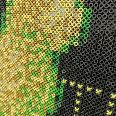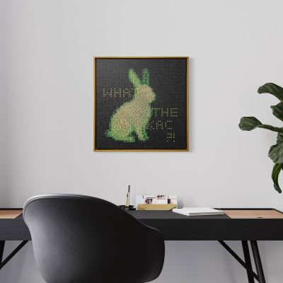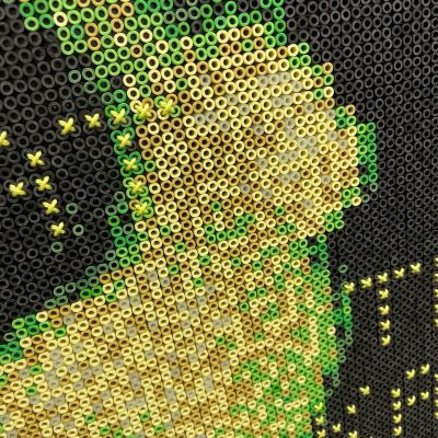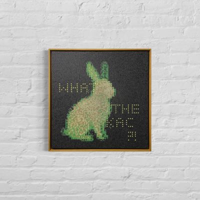 Ein leuchtender Hase aus Bügelperlen – pixelig, naiv, fast kindlich. Doch hinter dem Glühen steckt Kritik: Das Werk bezieht sich auf Eduardo Kacs „GFP Bunny“, ein gentechnisch verändertes Tier, das durch Fluoreszenz zum Kunstobjekt wurde. Mit dem Schriftzug „WHAT THE KAC?!“ hinterfragt das Werk, wie weit Kunst – und Wissenschaft – gehen darf, wenn das Lebendige zum Material wird. Das harmlose Bastelmaterial der 90er wird hier zur ironischen Waffe gegen die Hybris moderner Biotechnologie. Ein „Unwesen“ unserer Zeit – grell, künstlich, und erschreckend echt.